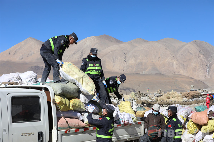 圖為西藏移民管理警察在定日縣長所鄉(xiāng)雜村為受災群眾轉移物資 攝影:郭遠敬