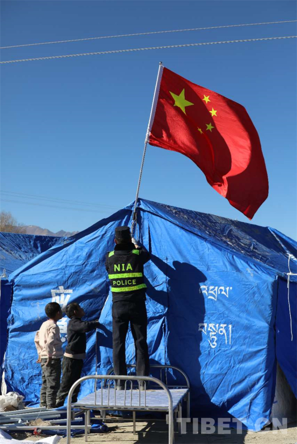 圖為西藏移民管理警察在定日縣長所鄉(xiāng)雜村受災安置點懸掛五星紅旗 攝影:郭遠敬