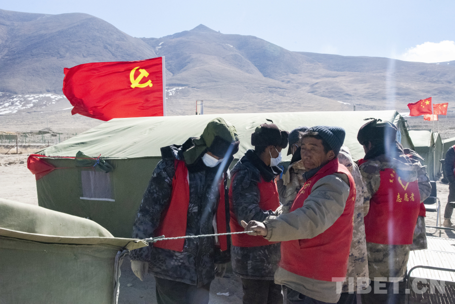 圖為楚卡村黨員志愿者正在為受災安置點的帳篷進行加固 攝影:趙振宇
