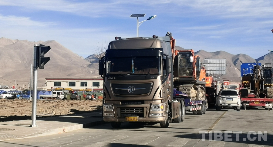 圖為卡車(chē)將大量挖掘機(jī)等工程機(jī)械運(yùn)往西藏自治區(qū)日喀則市定日縣 攝影:劉莉