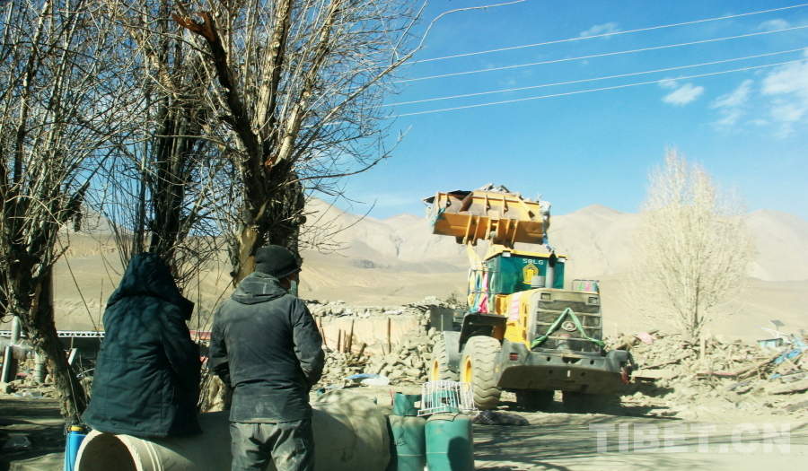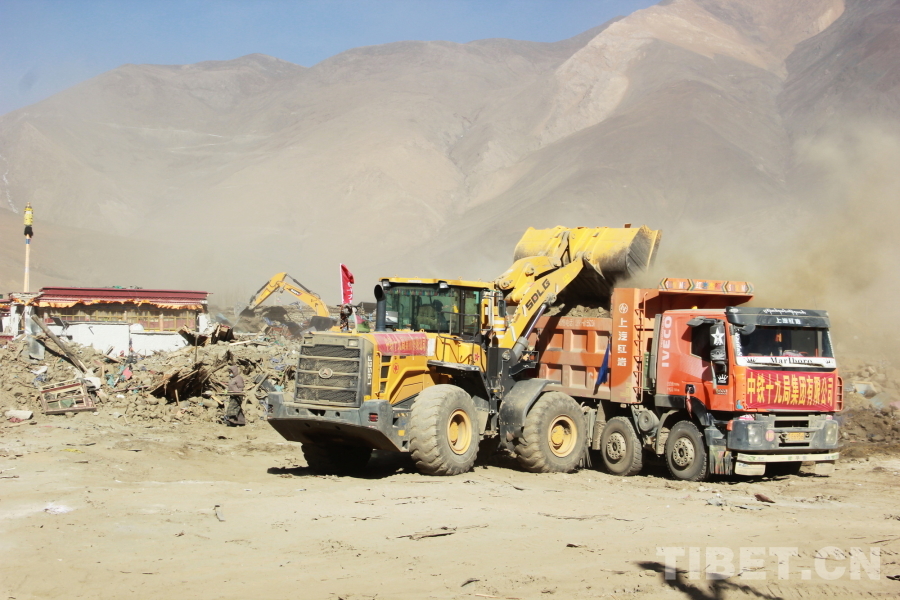 圖為地震重災(zāi)區(qū)西藏自治區(qū)日喀則市定日縣長(zhǎng)所鄉(xiāng)森嘎村危房除險(xiǎn)現(xiàn)場(chǎng),裝載機(jī)正在向渣土車(chē)傾倒建筑垃圾 攝影:劉莉