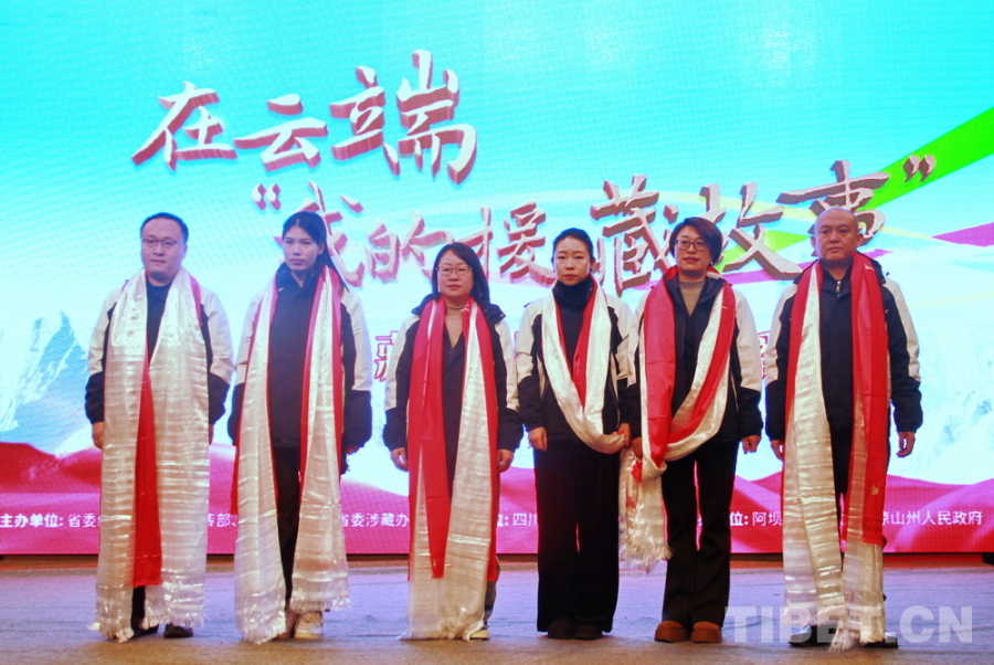 圖為“在云端·我的援藏故事”涉藏州縣行活動在四川省阿壩州松潘縣進(jìn)行宣講,6位優(yōu)秀援藏干部人才身披羌紅和哈達(dá)合影 攝影:劉莉