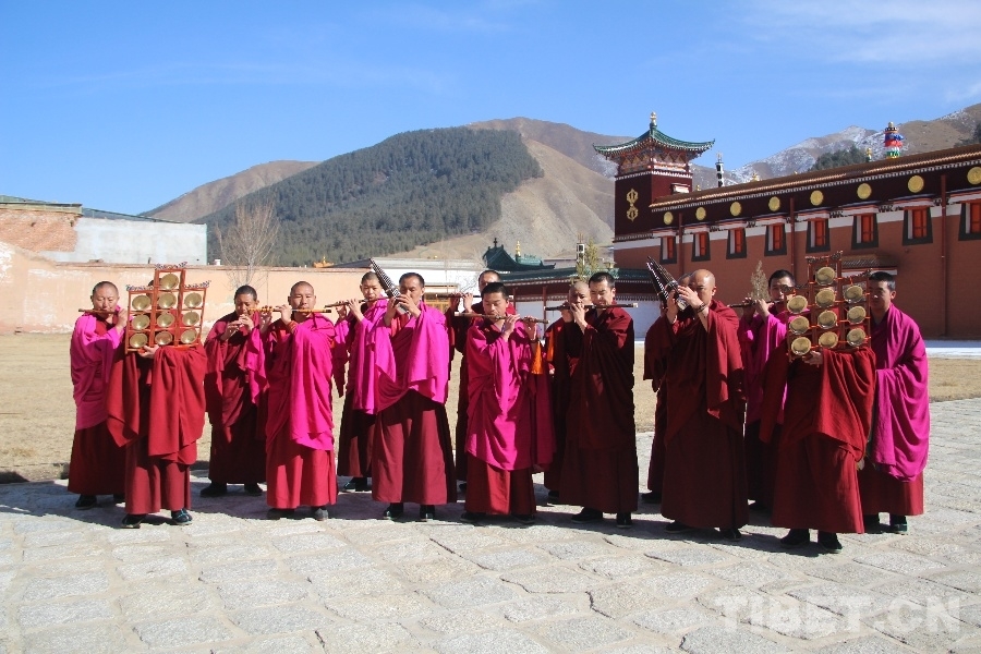 淡藍(lán)的天空中流淌著潔白的卷云,微風(fēng)陣陣拂過,窗前的香布一起一落,十多位身著紅色僧衣的拉卜楞寺僧人在陽光下演奏拉卜楞寺佛殿音樂道得爾。道得爾為藏文???????的音譯,意為用多種樂器合奏的音樂,多見于重要活動儀式時!