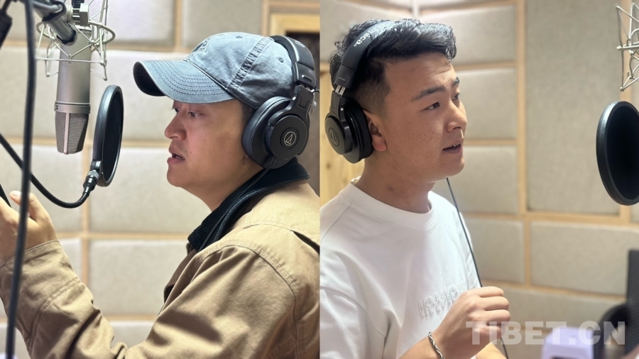 圖為歌手羅布桑珠和多吉正在錄音