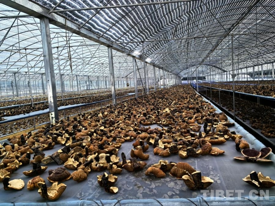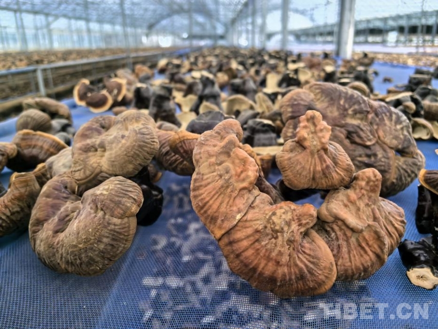 圖為紅太陽科技示范家庭農(nóng)場(chǎng)晾曬大棚里規(guī)模化晾曬的靈芝 攝影:王淑