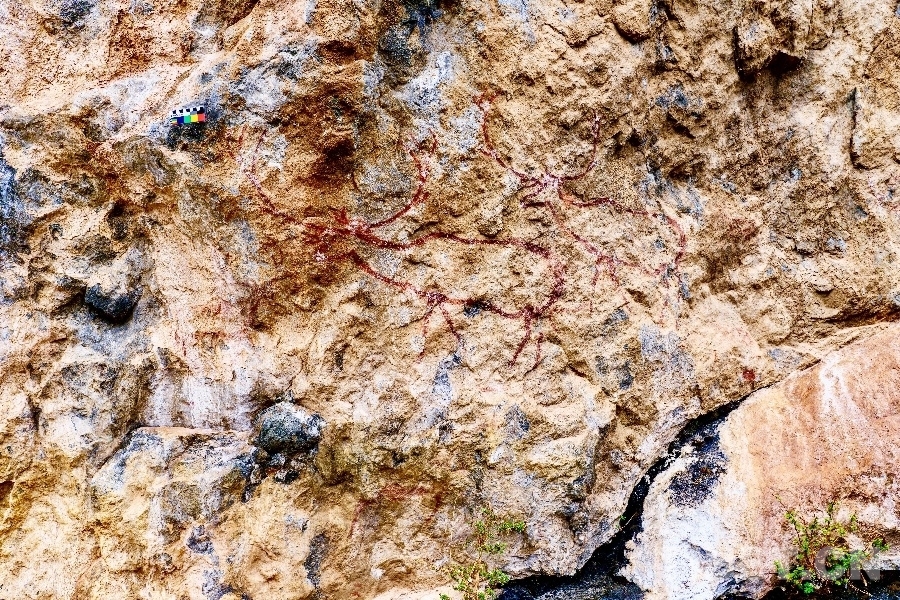 周行康:2023年6月,在海子山管委會(huì)巡山團(tuán)隊(duì)提供線索指引下,經(jīng)過數(shù)次實(shí)地調(diào)查,我們在“海子山-格聶”區(qū)域發(fā)現(xiàn)了紅顏料涂繪類巖畫群。通過邀請國內(nèi)考古權(quán)威機(jī)構(gòu)來現(xiàn)場采樣、并經(jīng)實(shí)驗(yàn)室測定,我們確認(rèn)這批巖畫是距今8000年前的古老創(chuàng)作。目前從世界范圍來看,石刻類巖畫的測年還沒有得到一個(gè)有效的解決,青藏高原的石刻類巖畫,一般推斷為距今3000多年,因而這批更久遠(yuǎn)的舊石器時(shí)代的“海子山-格聶”巖畫就顯得更有意義,而且它是目前已知的世界上同類風(fēng)格巖畫中海拔最高的巖畫——位于海拔4721米的高度。