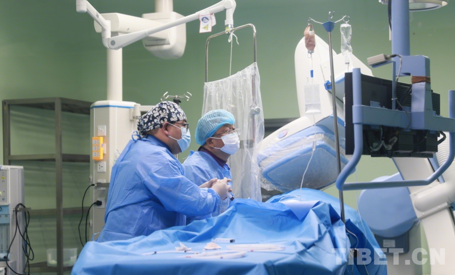 圖為陰赪茜(手術(shù)室內(nèi)右)趕赴阿壩州人民醫(yī)院手術(shù)救治急性心?;颊撸聊簧巷@示出陰赪茜正操作纖細(xì)的導(dǎo)絲嘗試通過患者發(fā)生閉塞的心臟血管 攝影:劉莉