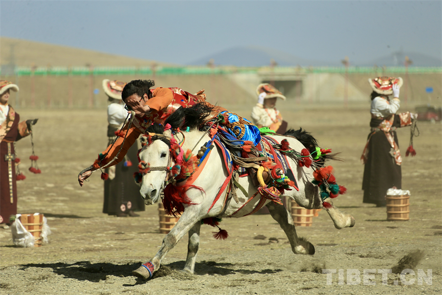 在海拔4000米左右的遼闊天地間,康巴漢子們駕馭著矯健的駿馬、身著華美的傳統(tǒng)服飾,如疾風(fēng)般掠過金色的草原,在馬背上展示跑馬射箭、乘馬射擊、跑馬拾哈達、跑馬倒立、跑馬懸體等高難度動作,馬蹄聲聲、歡呼陣陣,交織成高原最豪邁的樂章。(中國西藏網(wǎng) 記者/畢然 龍真多吉)