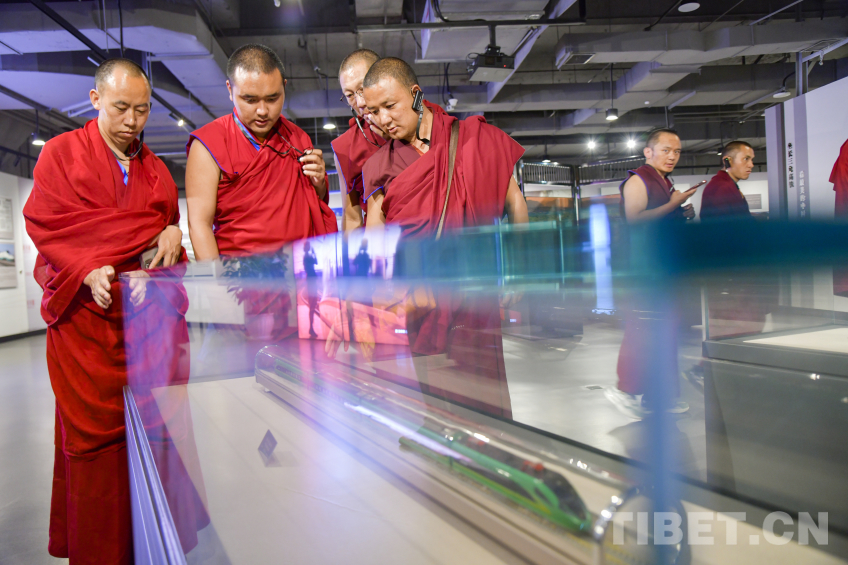圖為西藏佛學(xué)院師生在高原“綠巨人”復(fù)興號(hào)動(dòng)車組模型前駐足 攝影:趙振宇