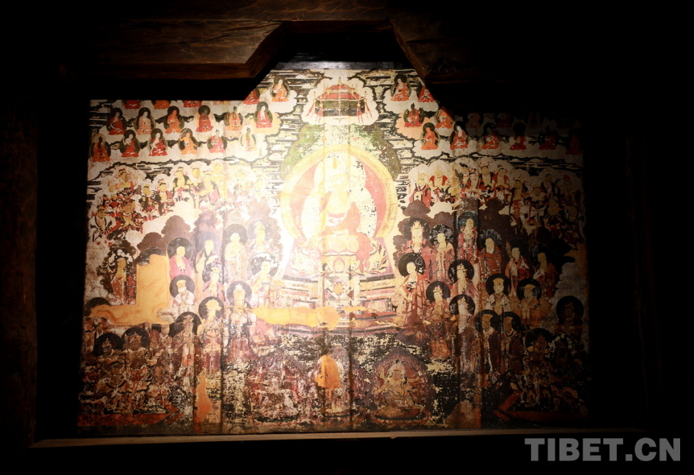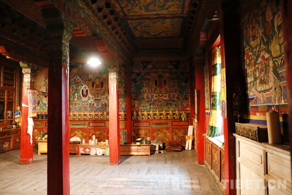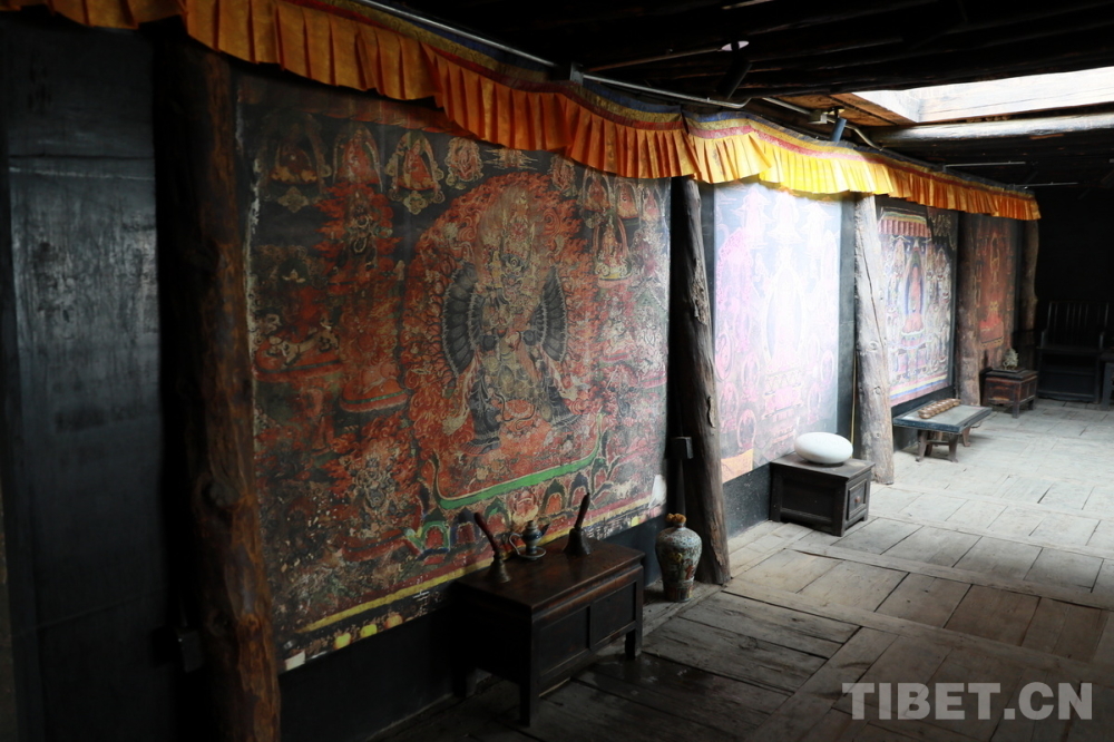 宗薩木府最驚艷的是其經(jīng)堂中歷經(jīng)380余年歷史仍色彩絢麗、保存完整的整堂壁畫。新中國(guó)成立后,宗薩木府曾被收歸公有,許多無(wú)房的當(dāng)?shù)刎毨罕姳话才抛∵M(jìn)了這里。“文革”時(shí)期,宗薩木府的經(jīng)堂被作為村里的倉(cāng)庫(kù),人們用報(bào)紙糊住壁畫,使這些藝術(shù)珍品沒(méi)有受到“破四舊”的影響。