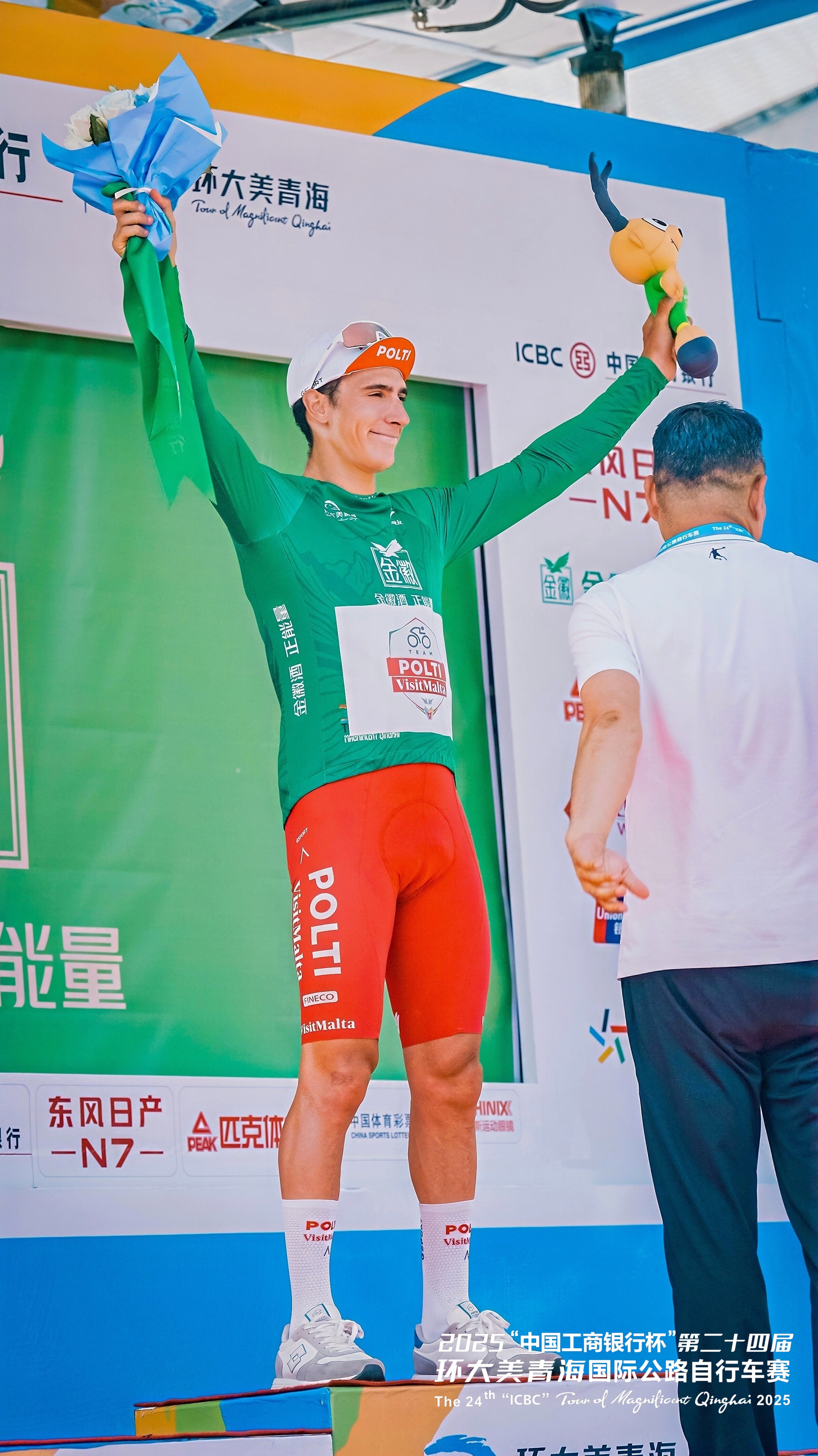圖為本屆環(huán)青賽第一賽段結束后“綠衫”獲得者。