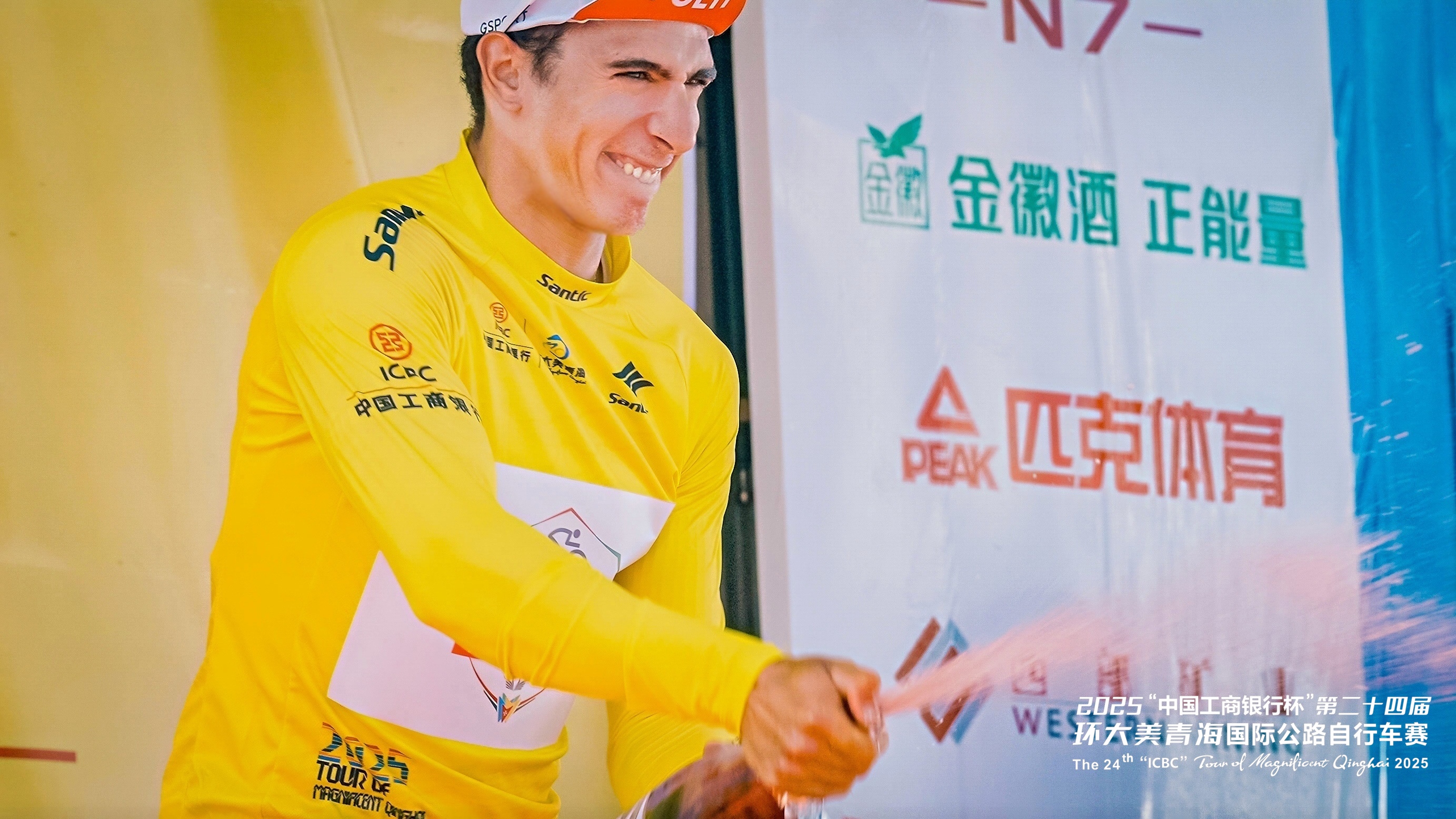圖為本屆環(huán)青賽第一賽段結束后“黃衫”獲得者。