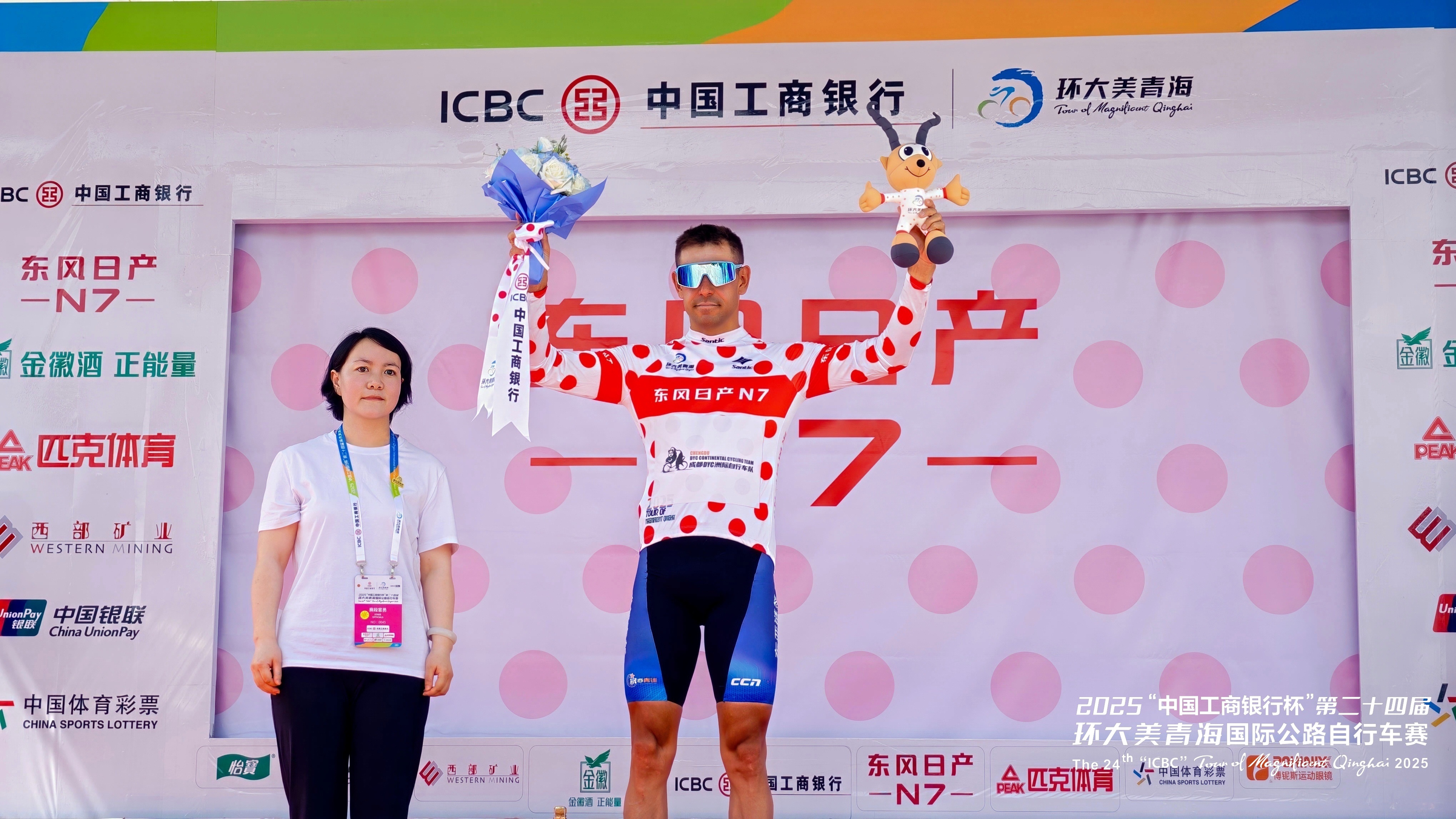 圖為本屆環(huán)青賽第一賽段結束后“圓點衫”獲得者,也被人們形象地稱為“爬坡王”。