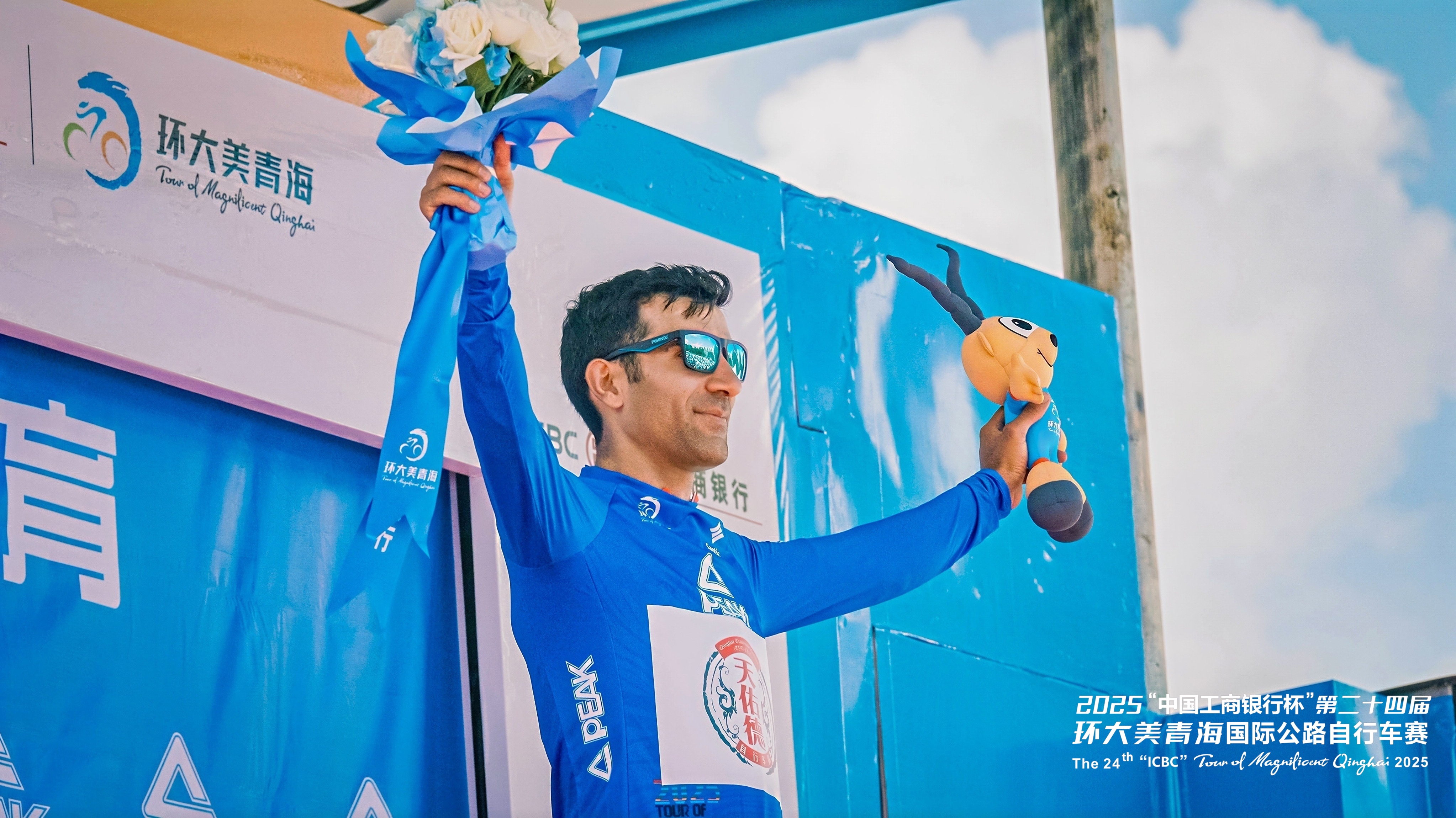 圖為本屆環(huán)青賽第一賽段結束后“藍衫”獲得者,相當于“亞洲車手中的黃衫”。
