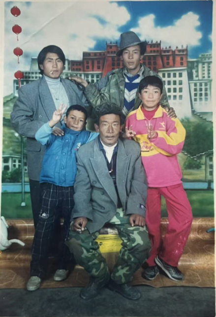 這是在我們家老房子門口照的。那時(shí)候全是土坯房,這間是四間房里最大的。大概是1990年左右。記得穿的這身衣服那些年很多人都穿,應(yīng)該是軍裝,穿著這衣服騎馬去挖藥很多次。人民公社時(shí)期我們有八個(gè)生產(chǎn)隊(duì),那時(shí)候要采藥掙工分,偶爾拉薩藏醫(yī)院的老師們會(huì)專程來(lái)札達(dá),我們也要幫忙去采藥。這邊藥材很多,如雪蓮花、黃連、蒂丁等。拍這張照片時(shí)孩子的鞋和幾件衣服是我自己織的,但要買好衣服還得去阿里地區(qū)。那時(shí)我丈夫已經(jīng)在開(kāi)車,我們家條件稍好些,但也不是村里最好的。