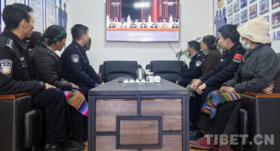 圖為日喀則邊境管理支隊(duì)下亞?wèn)|邊境派出所龐達(dá)警務(wù)室和鄉(xiāng)政府的工作人員共同觀看紀(jì)念中國(guó)人民抗日戰(zhàn)爭(zhēng)暨世界反法西斯戰(zhàn)爭(zhēng)勝利80周年大會(huì) 攝影:王楠