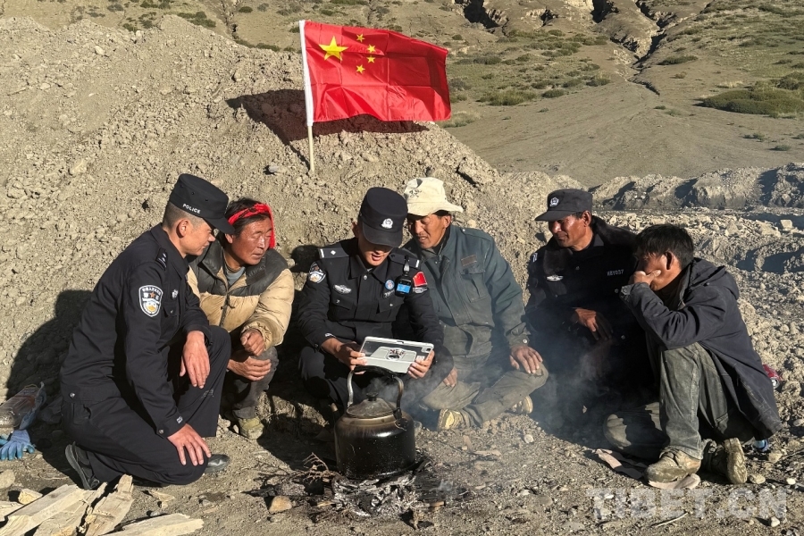圖為日喀則邊境管理支隊(duì)薩嘎邊境管理大隊(duì)昌果邊境派出所民警在海拔5300米的拉孜加久山口巡邏間隙與護(hù)邊員共同收看紀(jì)念中國(guó)人民抗日戰(zhàn)爭(zhēng)暨世界反法西斯戰(zhàn)爭(zhēng)勝利80周年大會(huì) 攝影:旦增扎巴