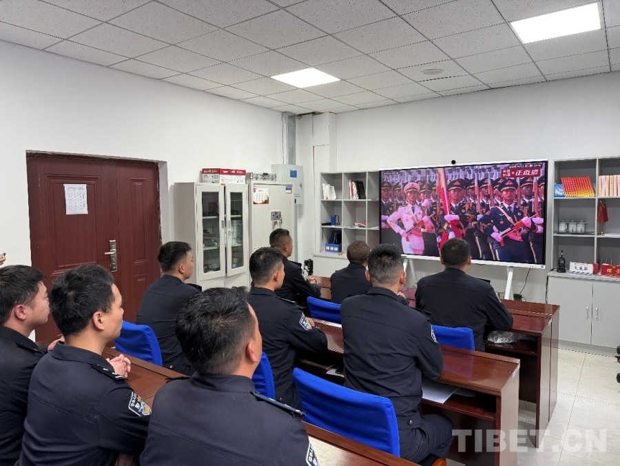 圖為日喀則邊境管理支隊(duì)亞?wèn)|邊境管理大隊(duì)組織全體在位民警觀看紀(jì)念中國(guó)人民抗日戰(zhàn)爭(zhēng)暨世界反法西斯戰(zhàn)爭(zhēng)勝利80周年大會(huì) 攝影:崔伊妮
