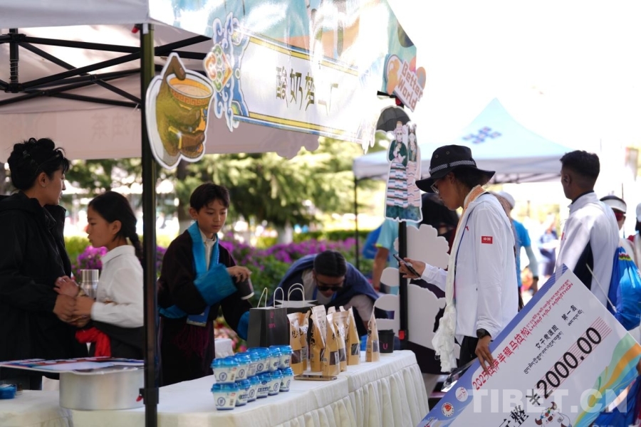 圖為特色展示區(qū)工作人員為參賽選手介紹西藏特色酸奶并贈(zèng)送品嘗