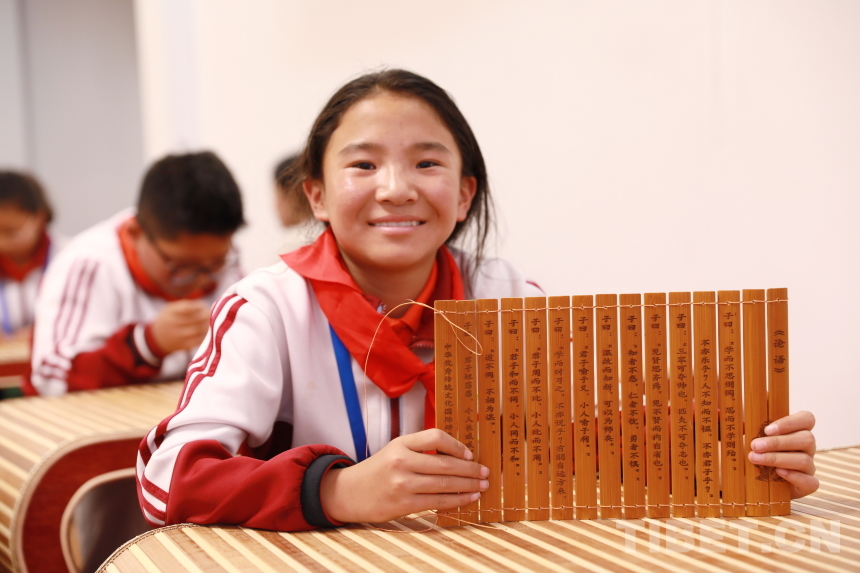 “子曰:‘學(xué)而不思則罔,思而不學(xué)則殆?!娰t思齊焉,見不賢而內(nèi)自省也?!卟换螅收卟粦n,勇者不懼?!敝窈喪止ふn堂上,孩子們將打磨光滑的刻字竹片用牛筋線仔細編連成冊?!巴瑢W(xué)們要記住,繩子折疊后要保持長度一致,位于竹簡上方的繩子向上穿孔,下面的繩子向下穿孔而過,這樣能保證竹片緊密相連,即‘上上下下’原則?!痹诶蠋熛ば牡闹笇?dǎo)與幫助下,孩子們稚嫩的雙手上下翻飛,很快便將散落的竹簡按照刻字排列整齊,并編織成冊。來自阿里噶爾縣昆莎鄉(xiāng)的巴桑卓瑪說道:“編竹簡需要繩子不斷交織,與藏族的紡織工藝有些相似。通過這次手工,我感受到了古人的智慧與中國傳統(tǒng)文化的神奇奧秘。”正是像竹簡、紙張一樣的文化載體,才讓先賢哲人的深邃智慧以文字的形式流傳至今,被千年后的人們傳承誦讀。