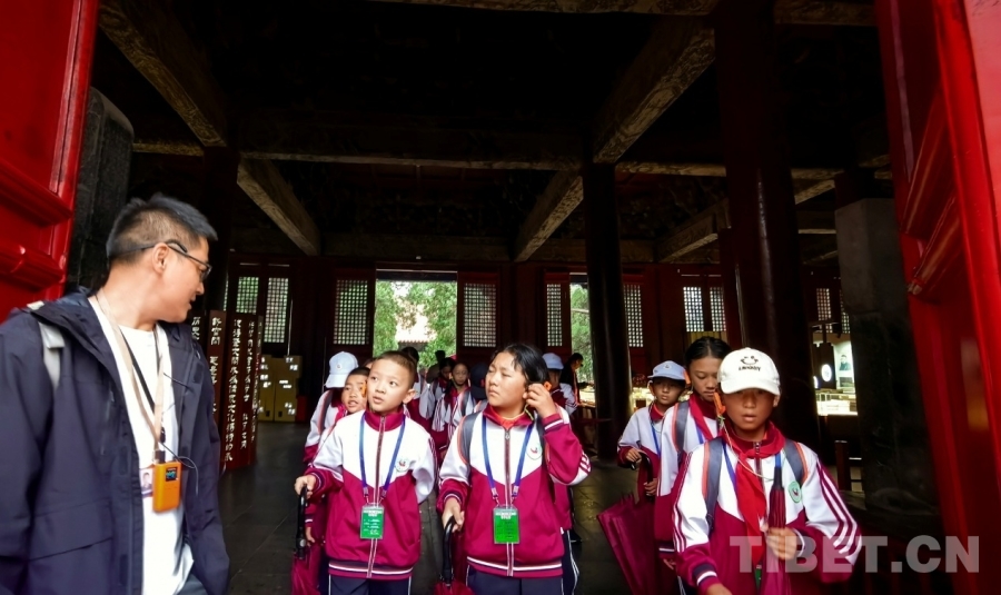 圖為西藏阿里噶爾縣孔繁森小學(xué)的孩子們?cè)谏綎|曲阜孔廟大成殿外聆聽講解并與講解員交流 攝影:劉莉