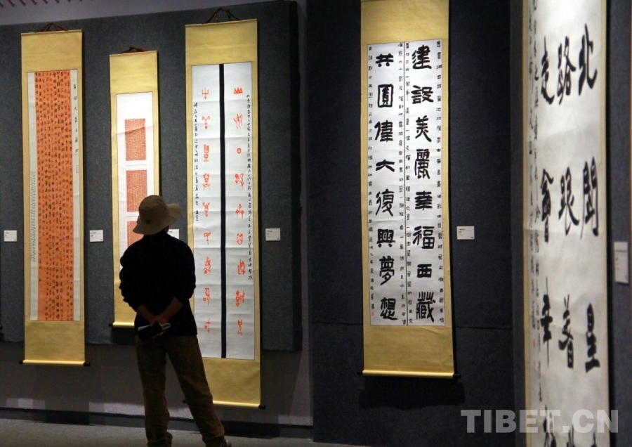 圖為觀眾在“雪域古城·圣地拉薩”第七屆書畫攝影藝術(shù)展欣賞書法作品 攝影:趙釗
