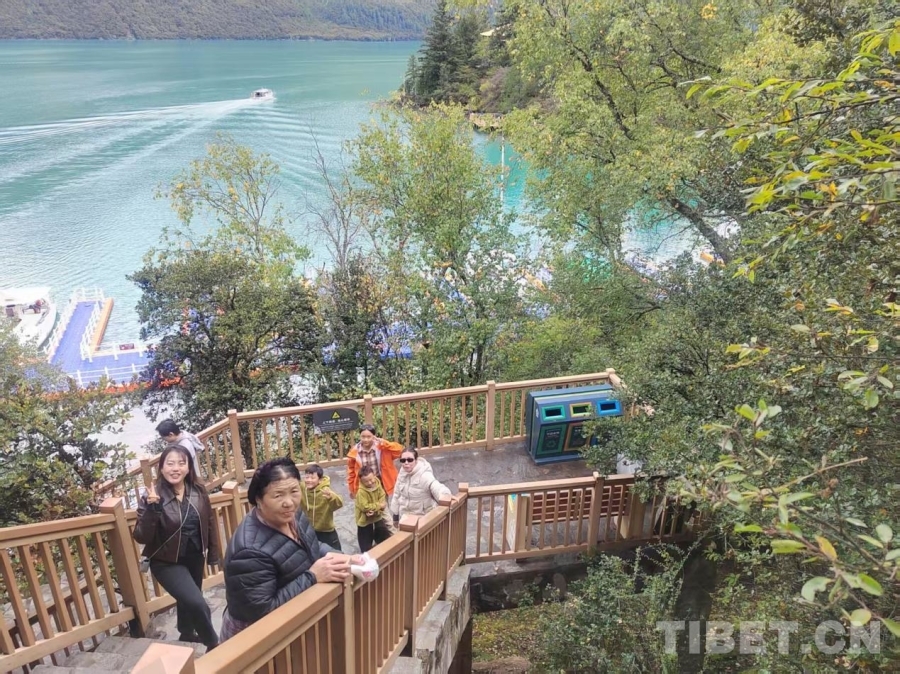 圖為雙節(jié)期間游客在巴松錯(cuò)拍照留念 攝影:仁增