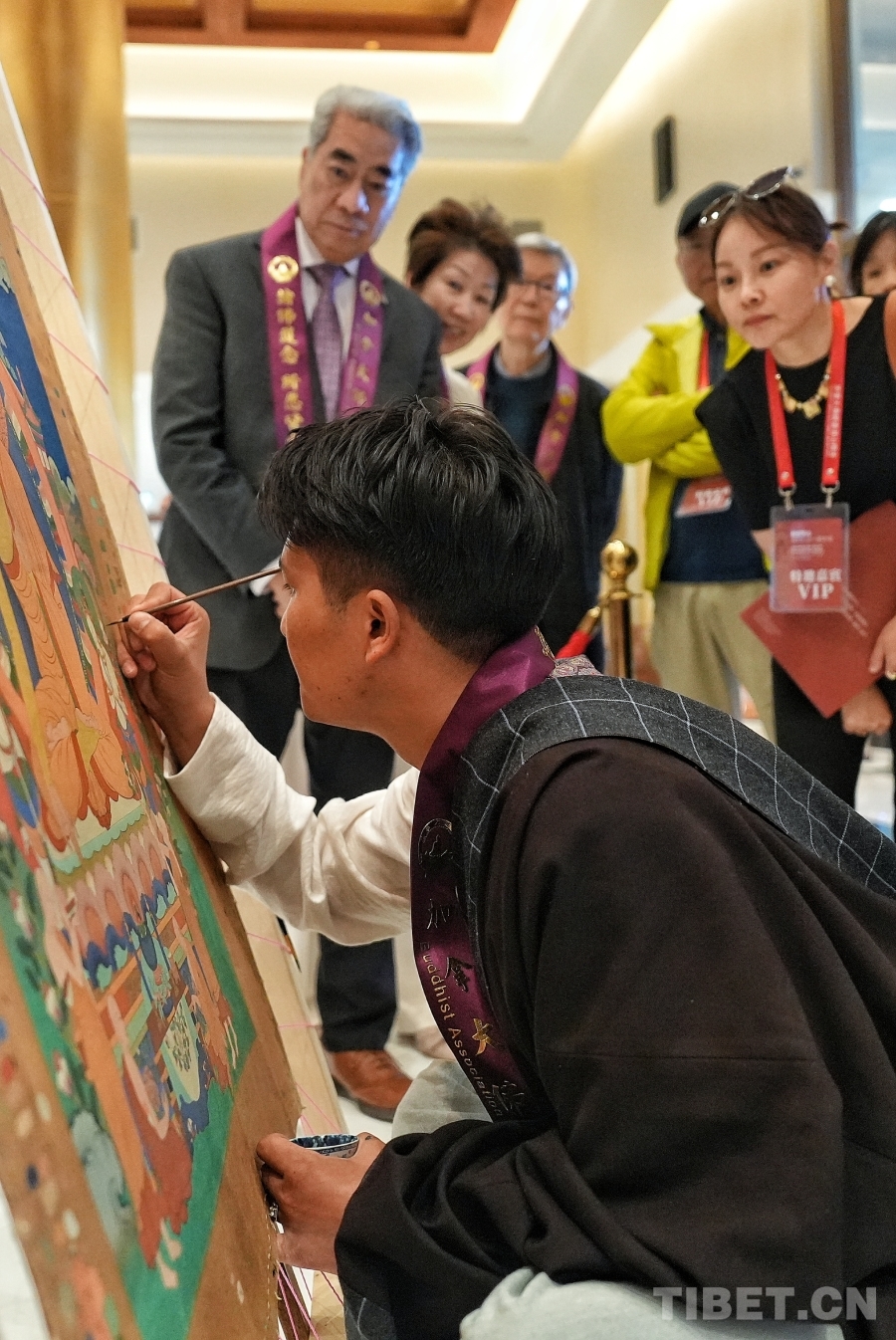 為了提升觀展體驗,展覽特別設置了“唐卡技藝現(xiàn)場演示”環(huán)節(jié)。壤巴拉非遺傳習協(xié)會青年藝術家申支足現(xiàn)場展示傳統(tǒng)唐卡繪制過程,他專注而細膩的筆觸,讓觀眾得以近距離觀察到非遺技藝的“匠心細節(jié)”,直觀感受每一幅作品背后所沉淀的時間與文化心血,從而更深入地理解中國優(yōu)秀傳統(tǒng)藝術的創(chuàng)作邏輯。