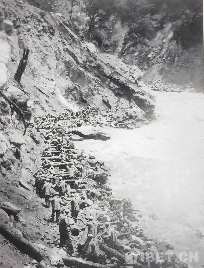 圖為上世紀(jì)50年代初,康藏公路扎木路段(位于今波密與魯朗之間)的筑路現(xiàn)場 作者供圖
