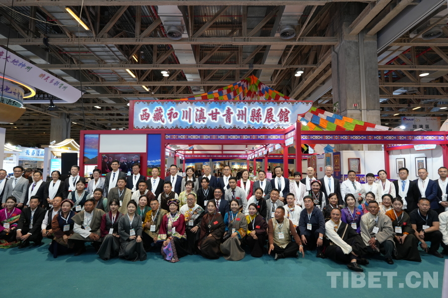 圖為參加展館開(kāi)幕式的主禮嘉賓與西藏和四省涉藏州縣參展企業(yè)代表合影 攝影:楊柳青