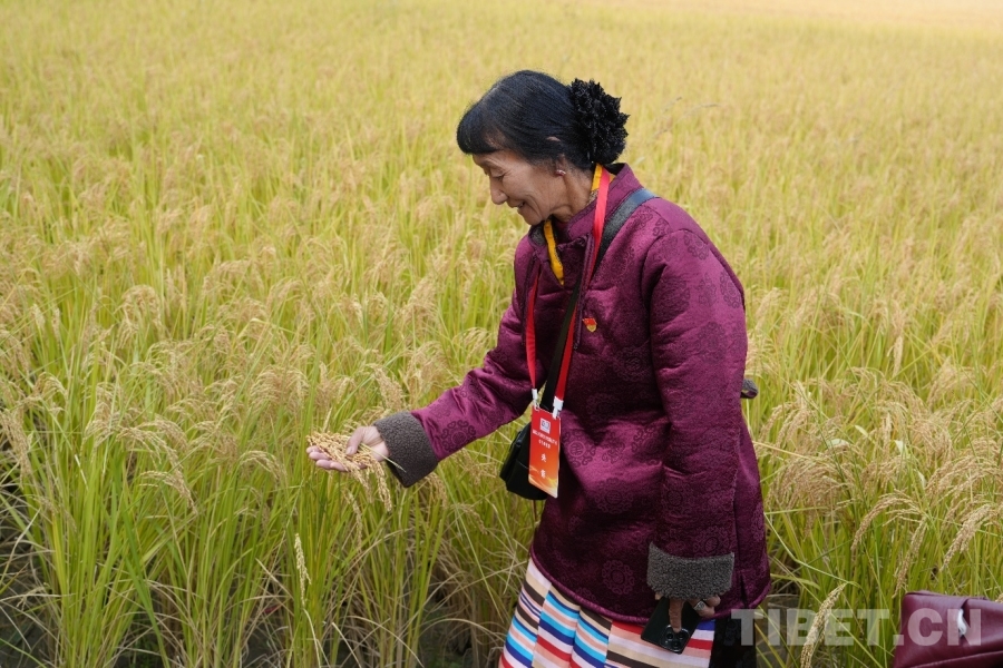 圖為西藏基層干部學(xué)習(xí)參觀團(tuán)成員央青反復(fù)摩挲著沉甸甸的稻谷 攝影:王茜