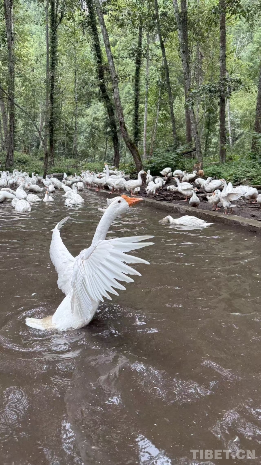 “嘎嘎——!”清晨,察隅的山霧還沒散盡,上察隅鎮(zhèn)珠聯(lián)村的山林間,上千只大白鵝已經(jīng)吵成一片。這些圓滾滾的“白團(tuán)子” ,或撲棱著翅膀在水塘中嬉戲,引吭高歌;或憨態(tài)可掬地在林間來回踱步,啄食雜草……把這個(gè)2024年10月才成立不久的搬遷新村,攪得熱鬧非凡。