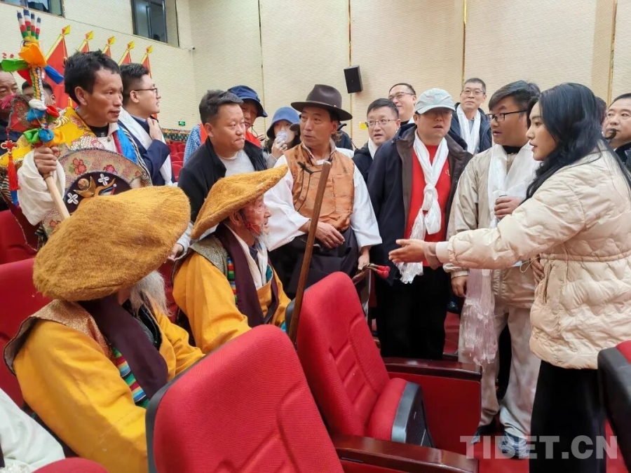 在南木林縣湘巴文化藝術(shù)中心內(nèi),南木林鎮(zhèn)雪藏戲隊(duì)的演員們頭戴色彩鮮艷的五彩面具,將經(jīng)典藏戲《智美更登》選段演繹得蕩氣回腸。高亢唱腔極具穿透力,粗獷又滿含張力的舞步踏在舞臺上,每一步都踩出湘巴藏戲的獨(dú)特韻味。接著,《格薩爾說唱》的雄渾敘事、《土布加諧慶》的歡快韻律、《扎木念》的悠揚(yáng)曲調(diào)一一上演,一場非物質(zhì)文化遺產(chǎn)的盛宴令調(diào)研組成員陶醉。他們的手機(jī)鏡頭緊緊追隨演員,將精妙的表演、動人的唱腔定格。表演間隙,調(diào)研組的藝術(shù)家們與演員圍坐在一起,圍繞表演技巧展開深入交流,探討唱腔中氣息的綿長運(yùn)用,研究舞步里節(jié)奏的細(xì)微變化。在思想的碰撞中,藏戲藝術(shù)的傳承創(chuàng)新脈絡(luò)愈發(fā)清晰。