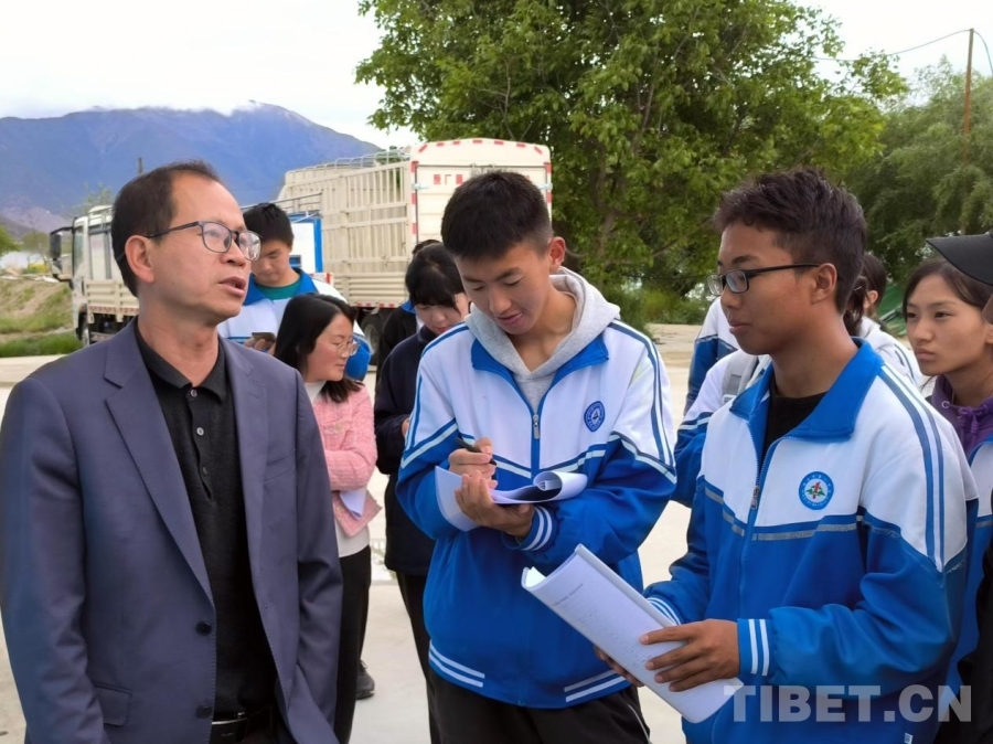圖為駱明飛(左一)為林芝一中學(xué)生科普高原漁業(yè)知識 受訪者供圖