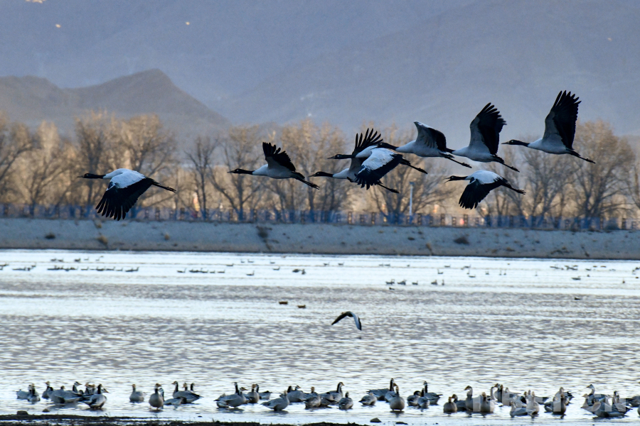 黑頸鶴是世界上最晚被發(fā)現(xiàn)的一種鶴類,是全球15種鶴類中唯一一種繁殖和越冬都在高原地區(qū)的鶴類,也是中國(guó)特有的珍稀鶴類,屬國(guó)家一級(jí)保護(hù)野生動(dòng)物,在《中國(guó)生物多樣性紅色名錄—脊椎動(dòng)物卷》(2020)中被列為易危(VU)物種。它們主要棲息于海拔2500米至5000米之間的高原濕地,曾因環(huán)境惡劣、食物匱乏導(dǎo)致種群數(shù)量岌岌可危,因此被譽(yù)為“鳥類大熊貓”,它們飛越崇山峻嶺,甚至飛過世界之巔——珠穆朗瑪峰,飛行高度可達(dá)萬(wàn)米。據(jù)學(xué)者觀察,黑頸鶴主要分布于中國(guó)甘肅、新疆、西藏、青海、云南、四川西部、貴州和內(nèi)蒙古。每年冬季,大批黑頸鶴從繁殖地遷徙到雅魯藏布江中游河谷地帶越冬,而拉薩市林周縣是黑頸鶴在此重要的越冬地之一,黑頸鶴數(shù)量可達(dá)到2000余只。