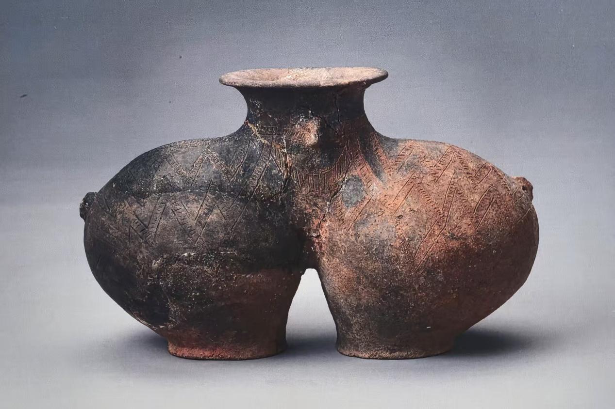 西藏昌都卡若遺址里出土了一只大約距今5000年的陶罐,它造型獨(dú)特、紋飾精美、色彩深邃,展現(xiàn)了高原先民極高的彩陶技藝,這便是如今西藏博物館的標(biāo)識原型——朱墨彩繪雙體陶罐。