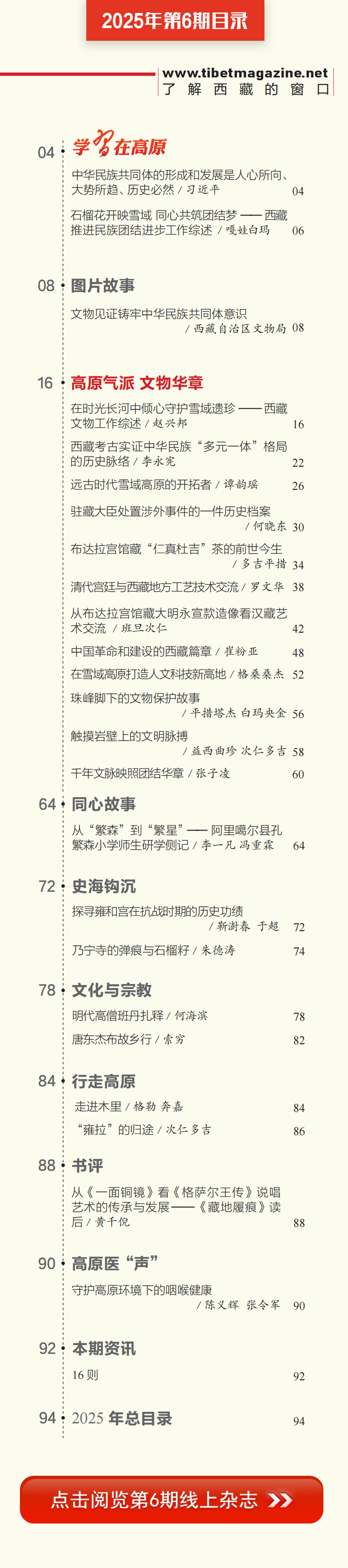 歲聿云暮,秋收冬藏?!吨袊鞑亍窛h文版2025年第6期如期與讀者見面了,本期雜志是西藏文物???,得到了西藏自治區(qū)文物局、故宮博物院的大力支持,集納了有關(guān)文稿13篇、圖片90余幅,從文物考古角度追溯各民族交往交流交融的歷史,展現(xiàn)青藏高原文明崛起與民族融合的壯麗詩篇。