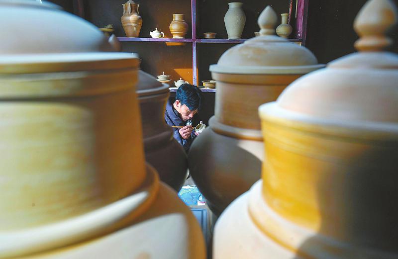 12月的冬日陽(yáng)光透過壤巴拉藏式陶藝傳習(xí)所的窗口,在飛轉(zhuǎn)的泥坯上折射出金色的光芒。在四川省阿壩藏族羌族自治州壤塘縣上壤塘鄉(xiāng)仁棚村的這間陶藝傳習(xí)所,澤郎斯加正在陶器原型上修坯。澤郎斯加和傳習(xí)所的18名學(xué)員,都來自于壤塘縣貧困牧民家庭,經(jīng)過六年的學(xué)習(xí)和進(jìn)修,他們?cè)谔账噦髁?xí)所已熟練掌握了藏陶的拉坯、修坯、燒制等綜合技藝,并完成了德育、藏文、漢語(yǔ)、數(shù)學(xué)、電子商務(wù)、藏漢文書法、基礎(chǔ)繪畫等課程培訓(xùn)。