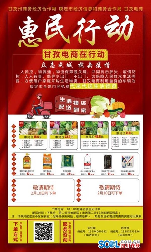 據(jù)悉,這是四川省甘孜州商務(wù)和經(jīng)濟(jì)合作局為配合防疫工作,降低市民出行交叉感染的幾率,聯(lián)合康定市經(jīng)合局、爐城和榆林2個(gè)街道辦9個(gè)社區(qū)、圣潔甘孜扶貧超市、康定民貿(mào)公司、康定鄰你超市、順豐甘孜快遞等企業(yè)和單位,為居住在康定新老城區(qū)的居民,專(zhuān)門(mén)開(kāi)展的“防疫套餐”送貨上門(mén)惠民行動(dòng)。
