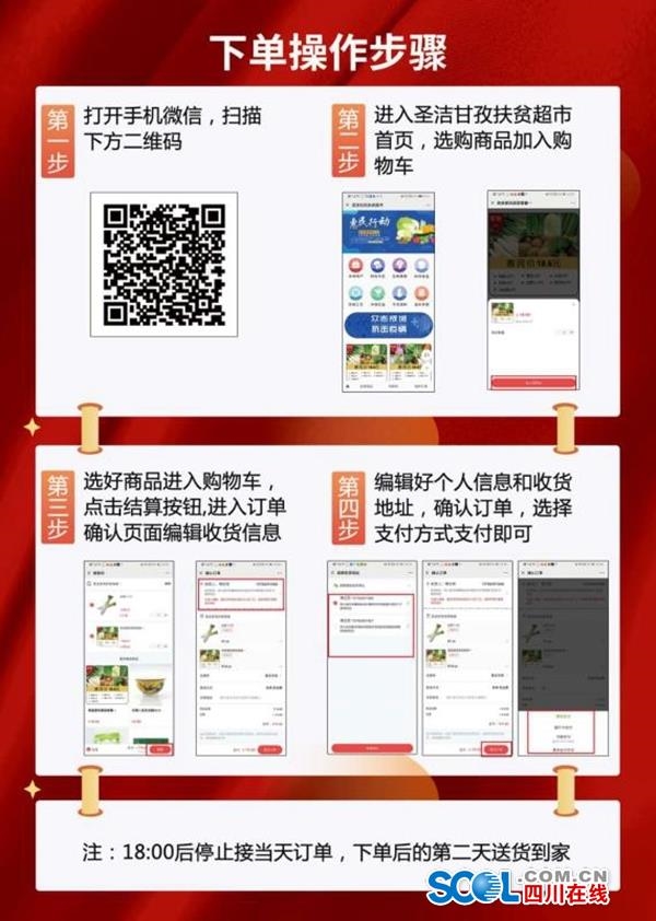 “防疫套餐”送貨上門(mén)惠民行動(dòng)從2月9日開(kāi)始試運(yùn)行,2月10日第一批蔬菜貨物正式送到家。家住在康定市新老城區(qū)的市民,只需通過(guò)掃描電子宣傳單的二維碼,進(jìn)入圣潔甘孜扶貧超市首頁(yè),選購(gòu)商品加入購(gòu)物車(chē),點(diǎn)擊結(jié)算,進(jìn)入訂單確認(rèn)頁(yè)面編輯收貨信息,之后確認(rèn)訂單選擇支付方式支付即可。當(dāng)天下單,最遲第二天就能在家免費(fèi)收貨。