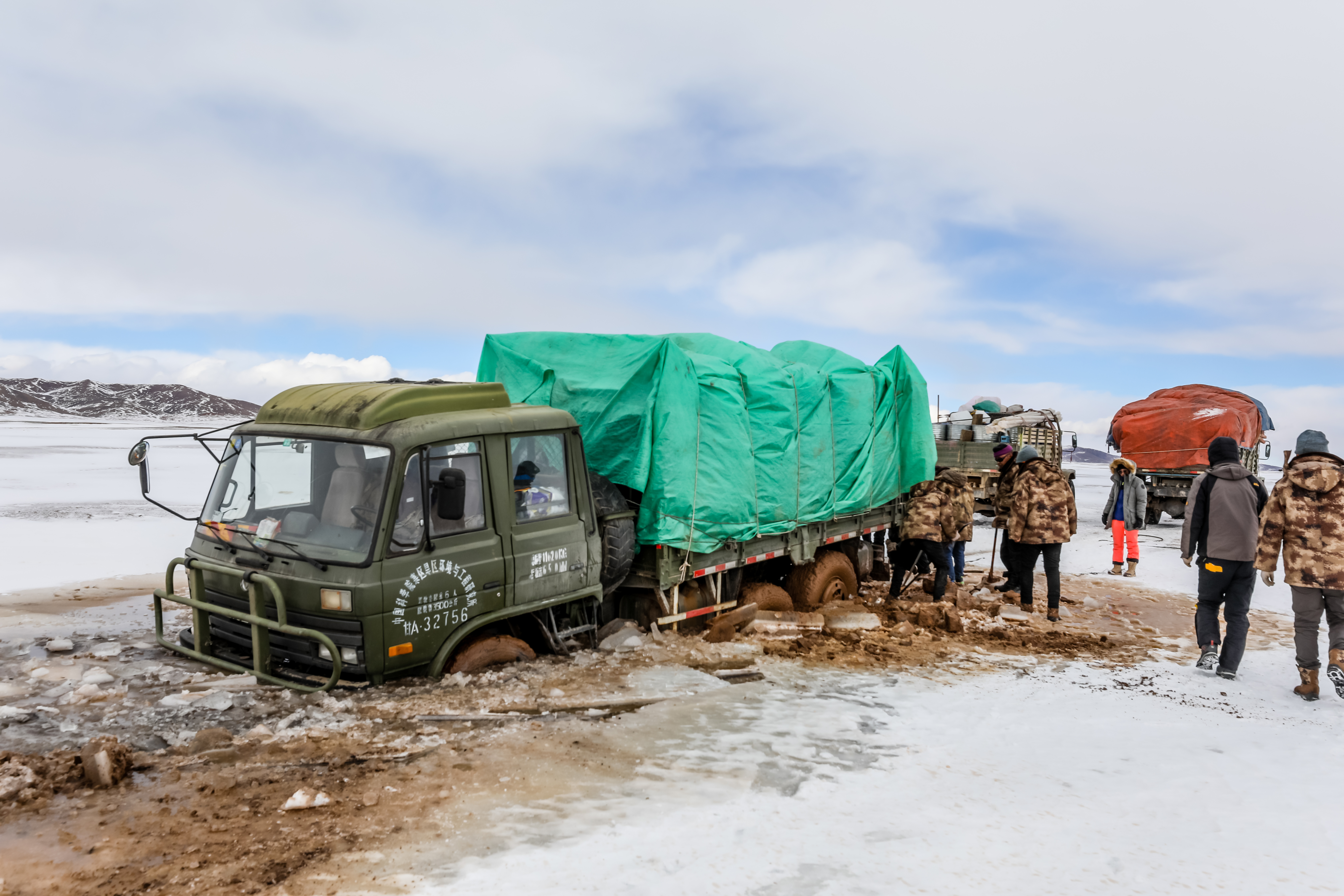 最后一次陷車臨近山的埡口,大雪掩蓋了尚未冰封凍實(shí)的小池塘。小型越野車通過后,大卡車順著車轍前行,深陷池塘。此時(shí)天已擦黑,狂風(fēng)呼嘯,科研人員只好把卡車上4噸的物品全部卸下,將車拖出,再進(jìn)行裝車?!傲阆率畮讛z氏度,5級(jí)風(fēng)的情況下,我們在那里折騰了4個(gè)小時(shí)。”
