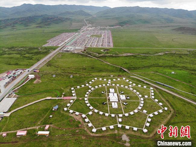 尕秀村的帳篷城由108頂大小各異的藏式風(fēng)格帳篷組成??罩懈╊豁旐攷づ袢缤活w顆璀璨的珍珠,點綴著曬銀灘草原的秀美。楊艷敏 攝