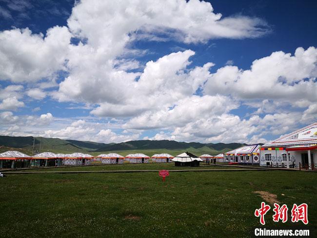 6月下旬,甘肅甘南藏族自治州碌曲縣尕海鎮(zhèn)境內(nèi)晴空萬里,湛藍(lán)的天空如同水洗過般通透明亮,輕薄如棉的云朵隨風(fēng)移動。被一碧萬頃的草原簇?fù)碇逆匦愦?,滿目皆是古老藏飾風(fēng)格與現(xiàn)代時尚的交織融合,吸引絡(luò)繹不絕的游人前來體驗“高原秘境”。