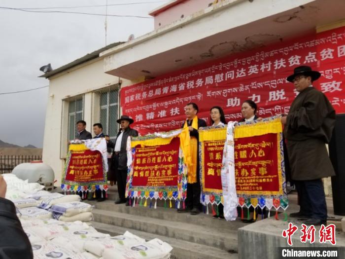 資料圖為青海省稅務(wù)局扶貧工作領(lǐng)導(dǎo)小組成員赴達英村捐贈物資。國家稅務(wù)總局青海省稅務(wù)局供圖