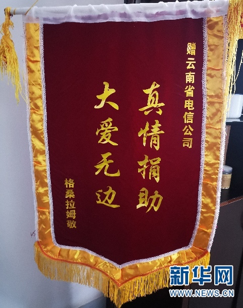 2019年9月,格桑拉姆將書有“真情捐助 大愛無邊”字樣的錦旗,送到前來燕門鄉(xiāng)調(diào)研的中國(guó)電信云南公司黨委書記、總經(jīng)理王宏手上,以表達(dá)自己的感激之情。