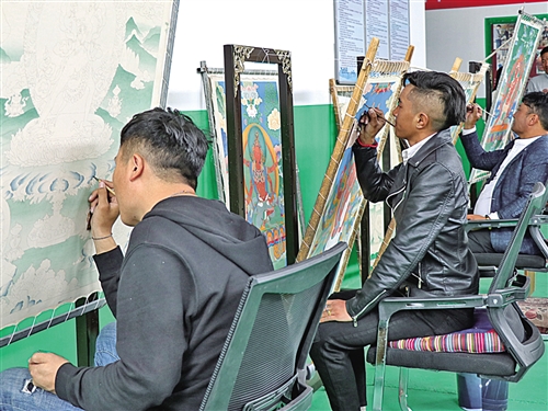 囊謙縣乃嘉瑪唐卡文化藝術(shù)有限公司里,在非遺傳承大師桑買(mǎi)的指導(dǎo)下,一批年輕的農(nóng)牧民唐卡繪畫(huà)藝人在成長(zhǎng),同時(shí)也拓寬了他們?cè)鍪罩赂坏那?。申維祖 攝