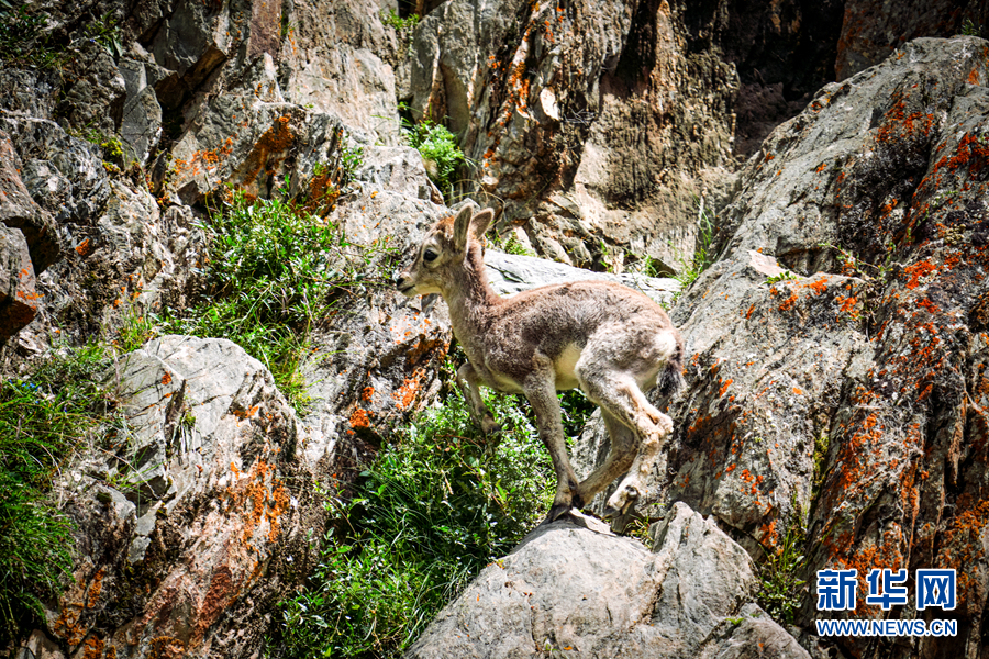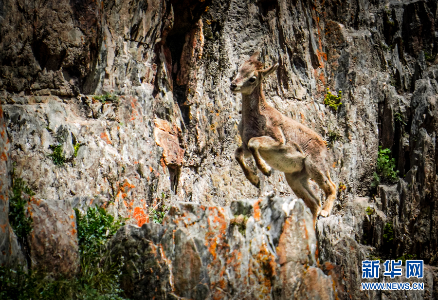 一只小巖羊在巖壁上嬉戲。新華網 宋忠勇 攝