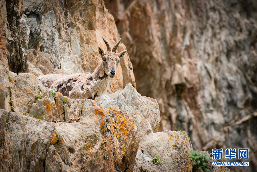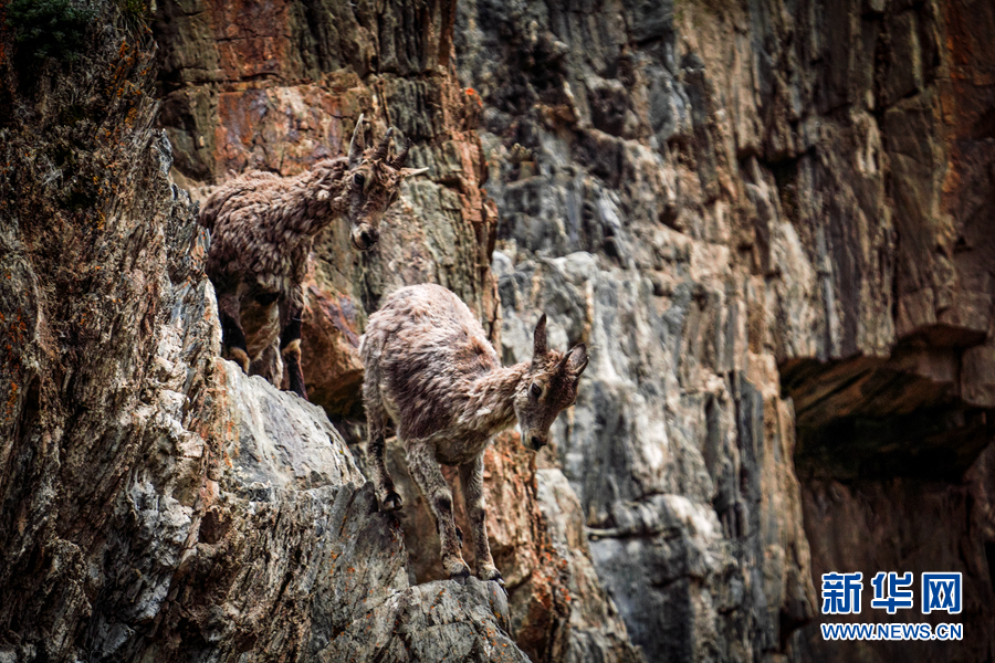 兩只巖羊站在巖壁上俯瞰。新華網 宋忠勇 攝