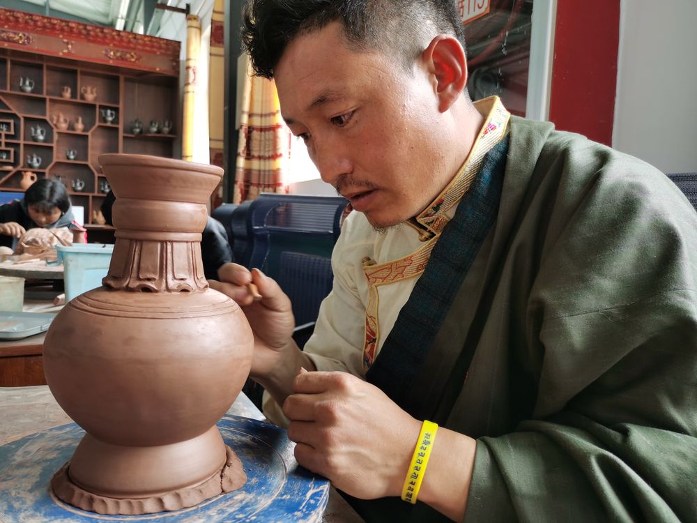 “我從小看著老藝人做黑陶,長大也成了黑陶手藝人。如今,不少人靠黑陶過上了好日子?!鼻嗪S駱洳刈遄灾沃菽抑t縣吉曲鄉(xiāng)山榮村古陶器傳承工程中心負責人才角仁增說。