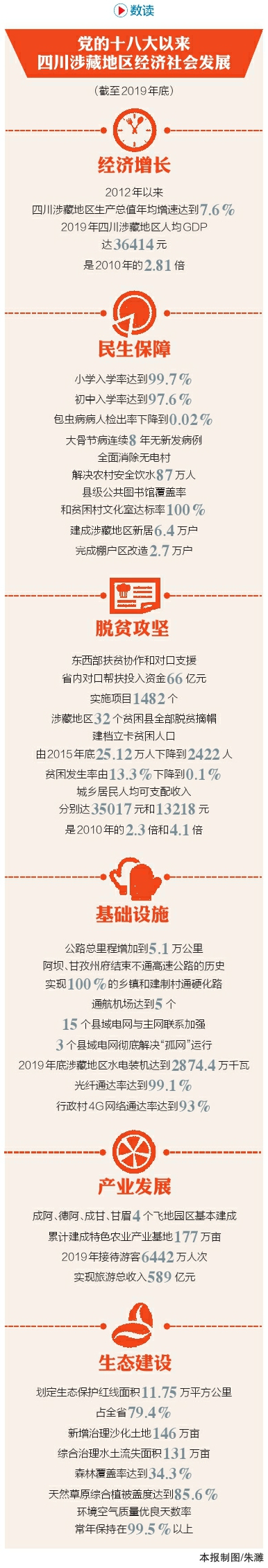 省委涉藏辦相關負責人告訴記者,近年來四川省涉藏地區(qū)加快發(fā)展特色優(yōu)勢產業(yè),推動全域旅游、高原農牧業(yè)、清潔能源、民族手工藝等提質增效。依托大熊貓、大九寨、大香格里拉、大草原等特色資源,涉藏地區(qū)大力發(fā)展全域旅游,“凈土阿壩”“圣潔甘孜”“大涼山”品牌影響力不斷提升,阿壩州、甘孜州成功創(chuàng)建首批國家級全域旅游示范區(qū),2019年接待游客6442萬人次、實現旅游總收入589億元。涉藏地區(qū)重點發(fā)展高原牦牛、特色果蔬、釀酒葡萄、優(yōu)質青稞、道地中藏羌藥材、野生食用菌等產業(yè),基本建成成阿、德阿、成甘、甘眉4個飛地園區(qū);大力推進清潔能源建設,水電裝機容量達到2875.6萬千瓦。截至2019年底,四川涉藏地區(qū)人均GDP達到36414元,是2010年的2.81倍;城鄉(xiāng)居民人均可支配收入分別達到35017元、13218元,接近全省平均水平,向2020年底實現全面同步小康邁出了堅實一步。